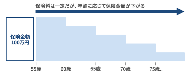 保険料が毎月一定の保険料建てで、年齢によって死亡保険金額が少なくなる商品なので、予算内で持てるだけの死亡保障を備えたい方にぴったりの商品です。